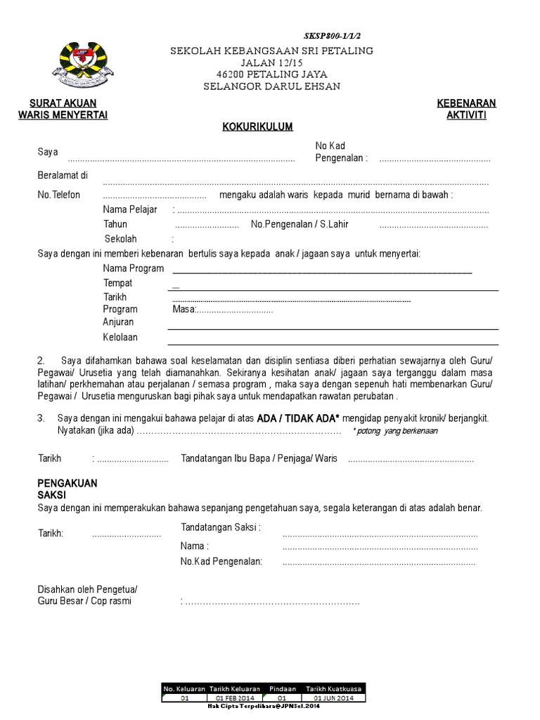 Surat Kebenaran Ibu Bapa Standard Jabatan Pelajaran Selangor Pdf