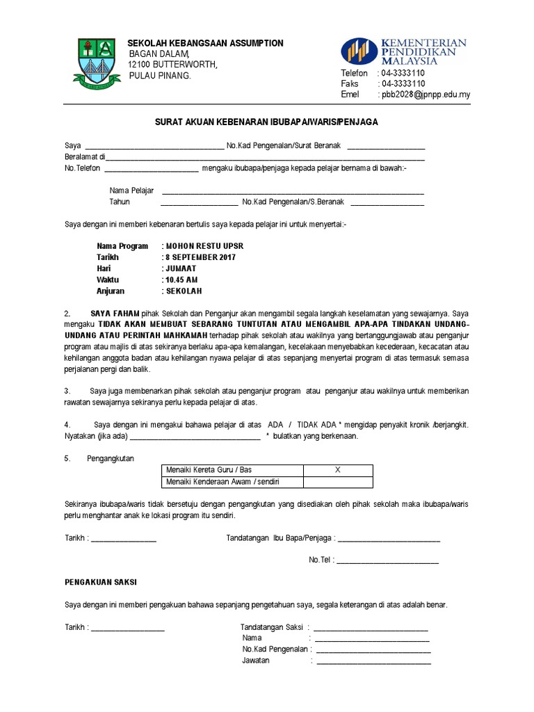 . Borang kebenaran waris 1. 17 1 4 surat kebenaran waris 17 1 5 peralatan aktiviti di tapak perkhemahan gergaji cangkul tali parang dan yang berkaitan 17 2 peserta 17 2 1 pakaian no. Menyiapkan surat pernyataan yang harus ditanda tangani.